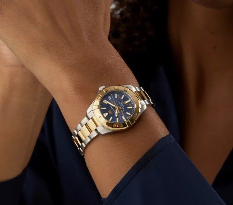 - The mix of cool steel + blue dial + gold accents gives this watch a dressy yet sporty look. TAG calls it “a deep dive in style.”